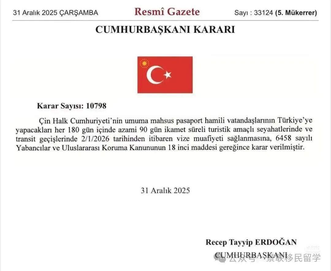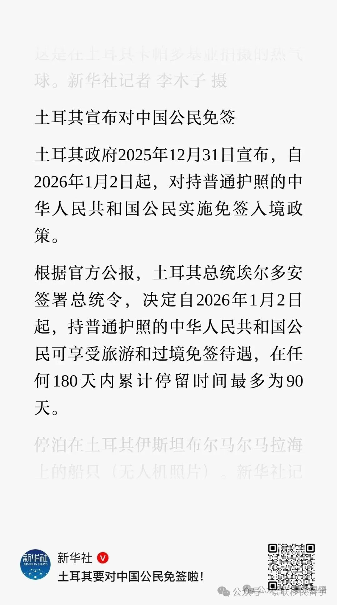 官宣土耳其免签据央视新闻报道:当地时间12月31日,土耳其《官方公报》发布总统令,宣布自2026年1月2日起,对持中国普通护照的公民实行免签入境政策。