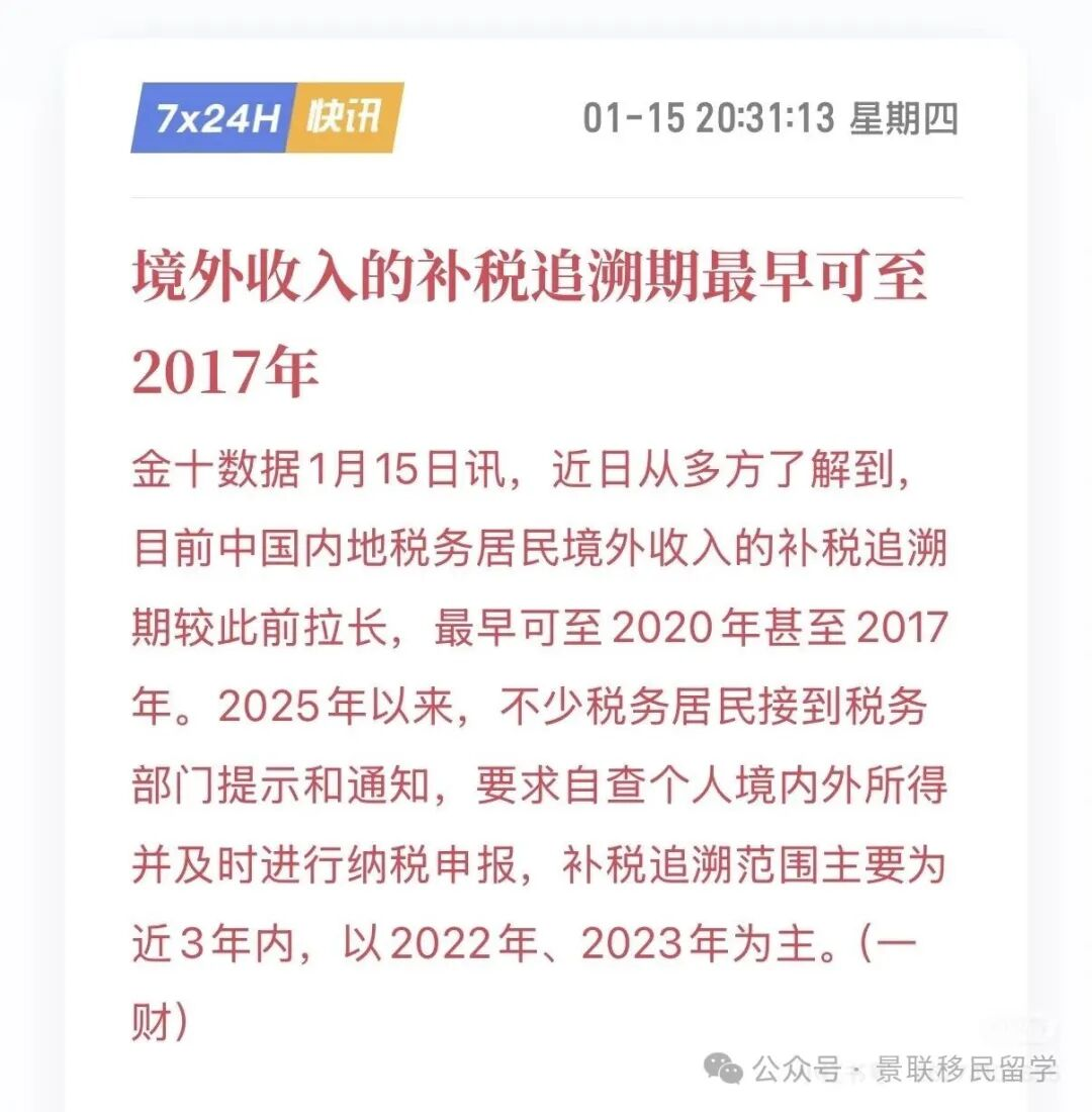 金十数据1月15日讯,近日从多方了解到,目前中国内地税务居民境外收入的补税追溯期较此前拉长,最早可至2020年甚至2017年。2025年以来,不少税务居民接到税务部门提示和通知,要求自查个人境内外所得并及时进行纳税申报,补税追溯范围主要为近3年内,以2022年、2023年为主。(一财)