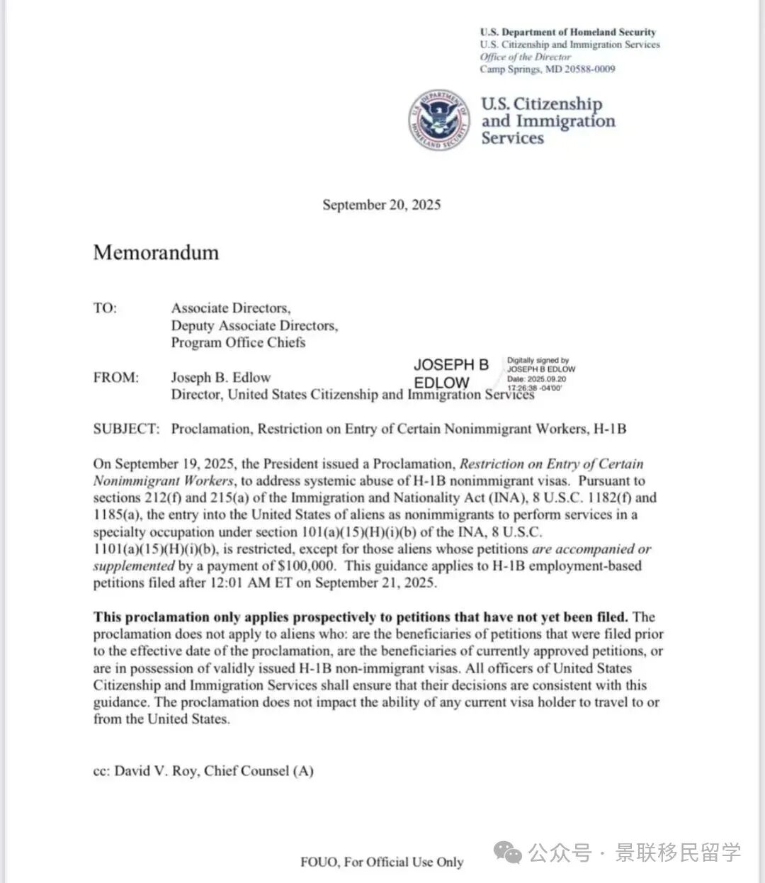 首先来看9月19日关于美国留学生的一则大新闻:据央视新闻,当地时间9月19日,美国总统特朗普签署行政令,大幅改革H-1B签证项目,要求申请人缴纳每年10万美元费用,否则不得入境。