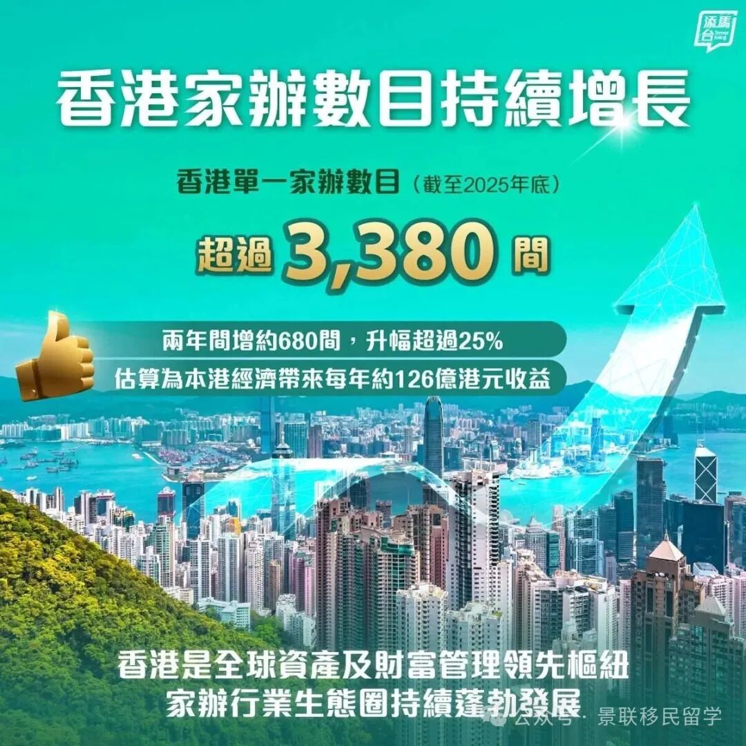 香港的单一家办单在本地直接聘用逾10000名全职专业人员,每年单是营运开支就为本港经济带来每年约126亿港元收益。